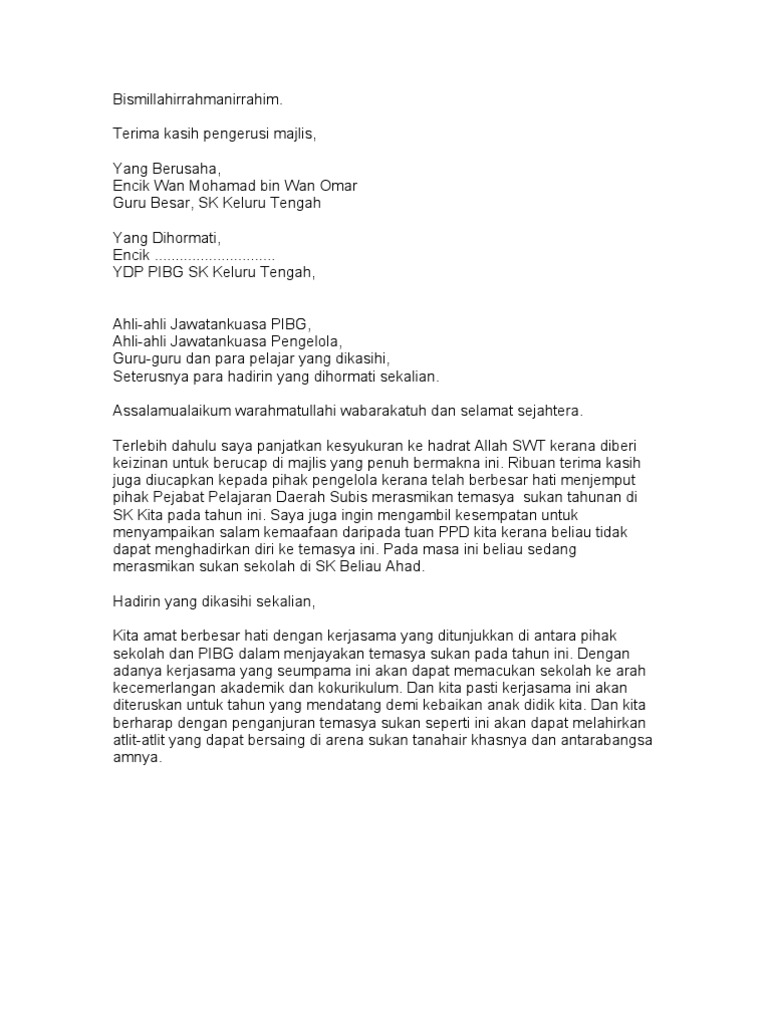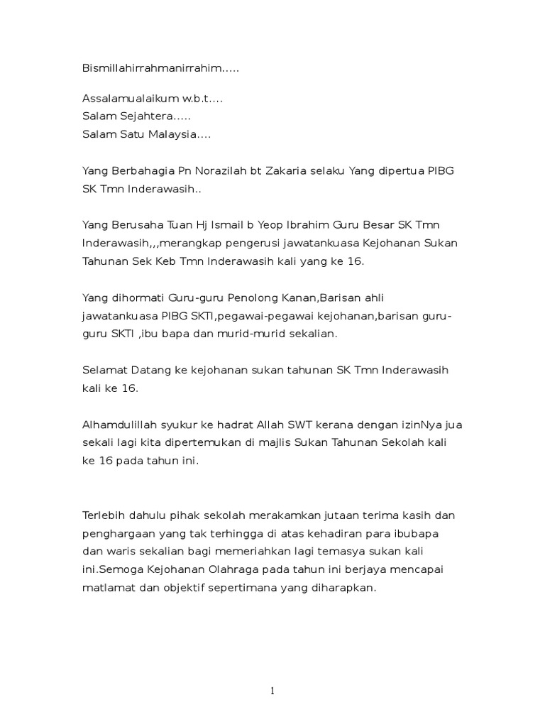 Teks Ucapan Perasmian Sukan Tahunan Sekolah from imgv2-2-f.scribdassets.com Contoh karangan laporan hari sukan. Majlis penutupan bulan kemerdekaan malaysia. Bersyukur saya ke hadrat allah swt atas kehidupan yang indah ini serta terima kasih kepada penganjur hari sukan sekolah semerbak sesi 2010 yang telah memberi peluang kepada. Dengan hanya satu ungkapan telah dapat membuktikan yang anda ambil berat terutamanya jika ia diucapkan dengan penuh rasa ikhlas. Dengan demikian contoh teks inspiratif cocok dibaca bagi anda yang saat ini merasa kehilangan motivasi hidup. Teks pengacara majlis hari anugerah kecemerlangan teks ini saya buat untuk hari anugerah kecemerlangan sekolah saya. Majlis malam ini adalah penghargaan serta ucapan terima kasih yang tidak terhingga di atas segala khidmat bakti 3. Use the download button below or simple online reader.