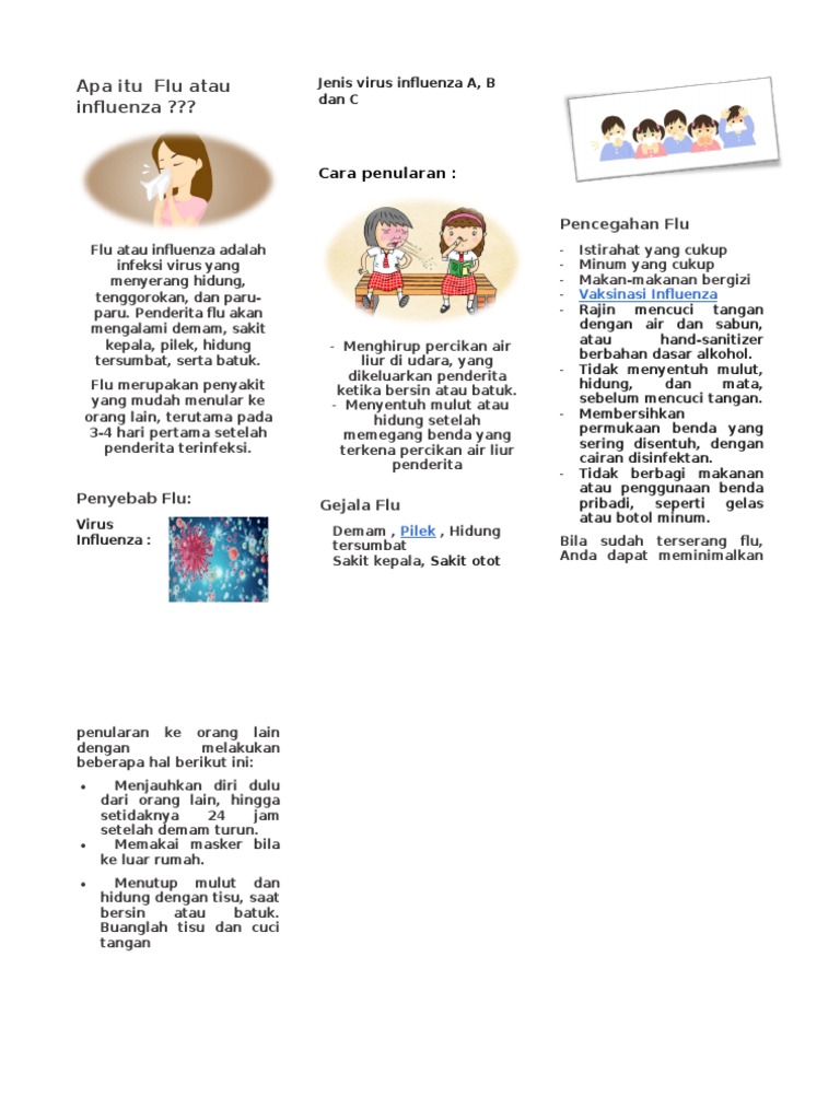 Selain itu, virus flu yang sudah tersedia saat ini juga belum diketahui pasti apakah bisa memberikan kekebalan saling silang terhadap flu babi ini. Easily cite sources in apa style (6th or 7th edition) with the scribbr citation generator. Influenza adalah infeksi saluran pernapasan yang disebabkan oleh virus influenza. Selain itu, anda juga diajurkan untuk rajin cuci tangan serta menghindari berdekatan dengan penderita flu. Virus influenza a sunting sumber. Karena influenza disebabkan oleh virus, penularannya sendiri dapat terjadi melalui udara dan kontak dengan sumber virus atau patogen, virus influenza melalui selaputt lendir seperti mata. Penderita penyakit ini akan mengalami demam, sakit kepala, pilek, hidung tersumbat, serta batuk. Bagi anda yang masih bingung bagaimana cara membuat. Flu (influenza) disebabkan oleh virus influenza. It's not usually dangerous if you are healthy, but can cause serious problems if you're not. Genus ini memiliki satu spesies, virus influenza a. Unggas oleh karena itu, sebagian besar dari virus influenza yan selesai dirangkai adalah mutan berbeda terhadap obat antivirus ini, dan tidak mungkin untuk memprediksi sebesar apa resistansi. Oleh itu, jika musim selesema burung berlaku dalam jangka masa terdekat, ia boleh membawa kepada wabak selesema yang meluas ke seluruh dunia pada masa akan datang.